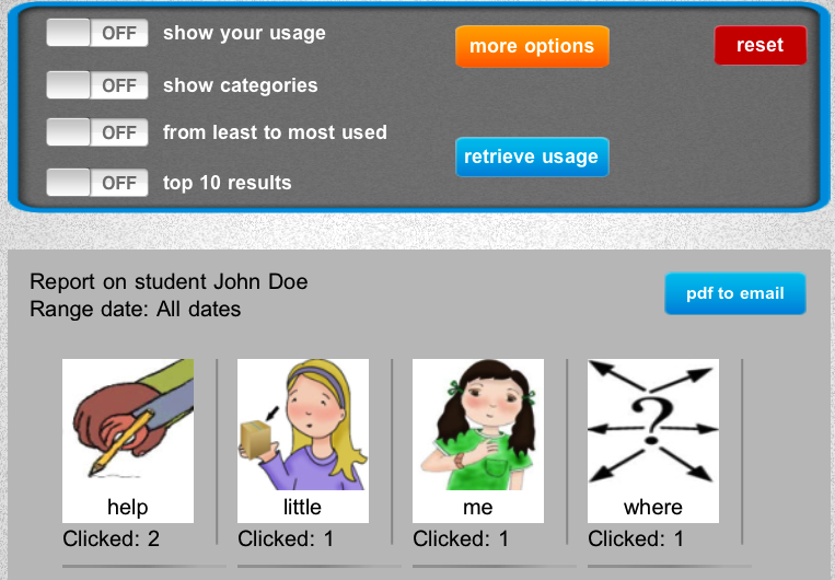 Teachers and parents have the ability to monitor the progress of a child by looking at the frequency of usage of each of the images that have been clicked during a specific period of time. This feature also assists in identifying if a child has a preference for photos or cartoon-like images. The data retrieved are saved in a PDF file, which can be emailed to parents or stored for future analysis.