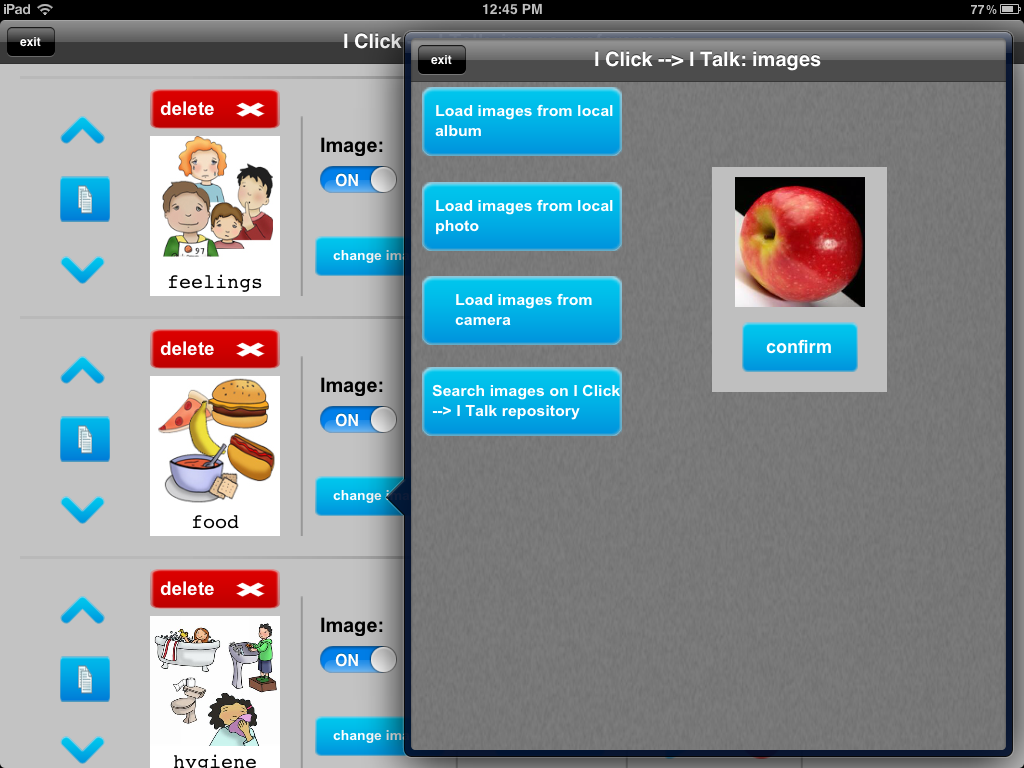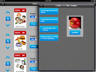 Teachers and parents can import and crop their own images/photos or replace preloaded images using those with which the child is already familiar. They can also take pictures using the camera of the device. I Click → I Talk provides free access to an on line repository of over 1000 cartoon-like images even in black and white.
