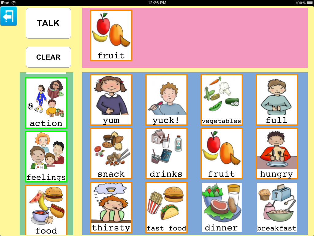Teachers and parents have the ability to choose from several layout and image size options. This feature helps children who are non verbal or minimally verbal and adults with stroke and traumatic brain injuries to use the visual layout that best fits their needs. Also people who are visually impaired can benefit from the larger image size. See the possible configurations by clicking here.